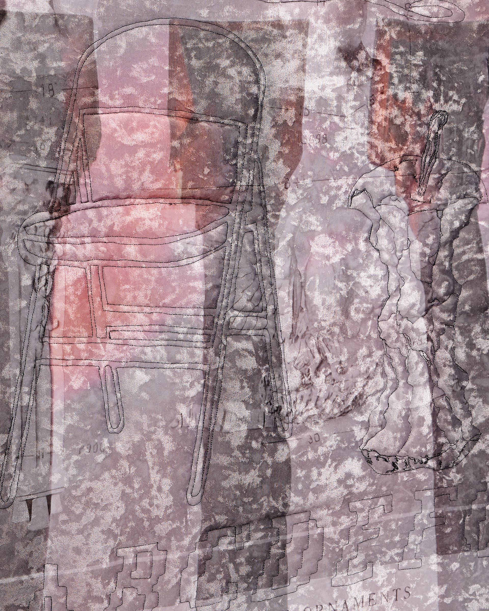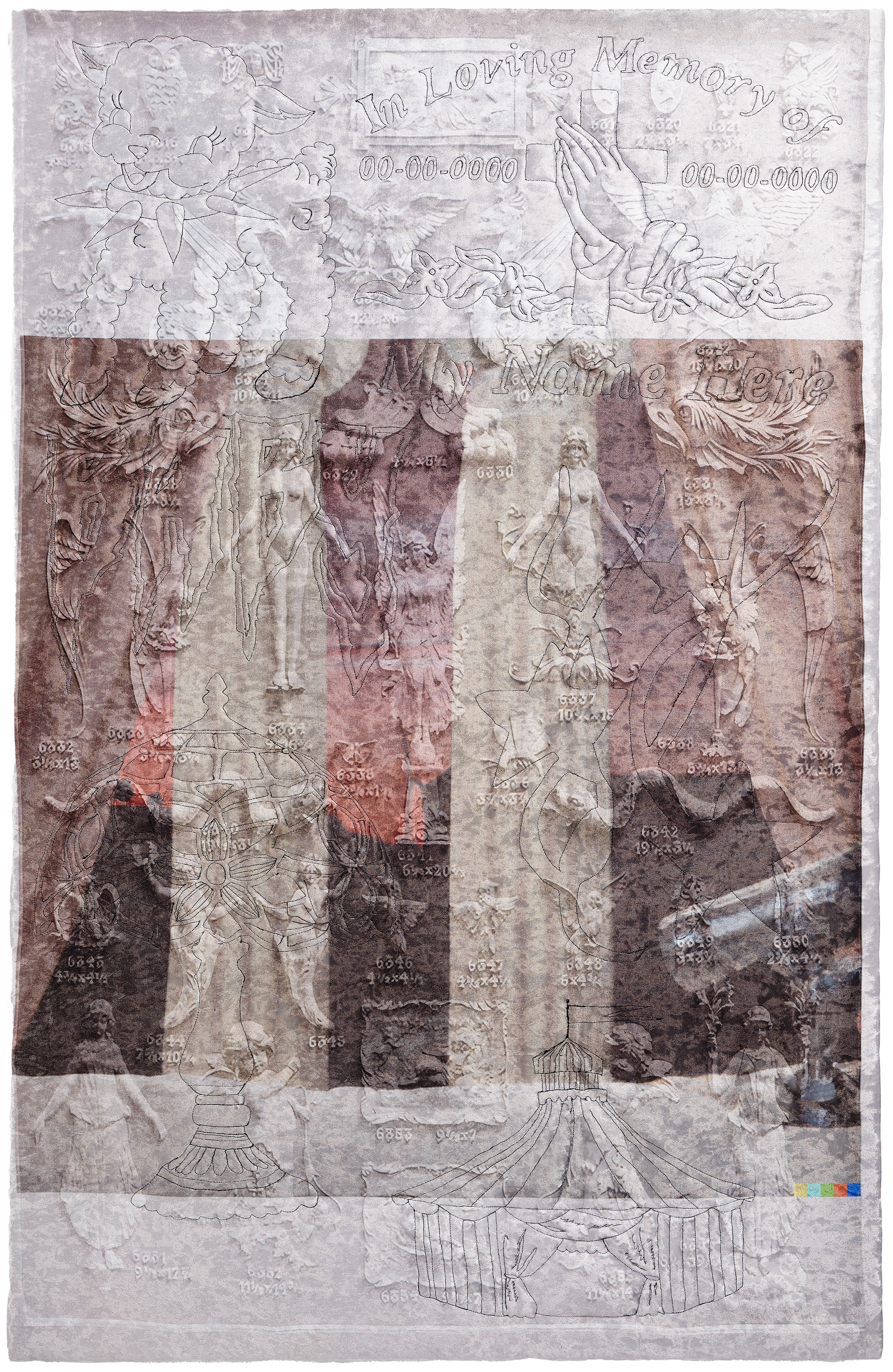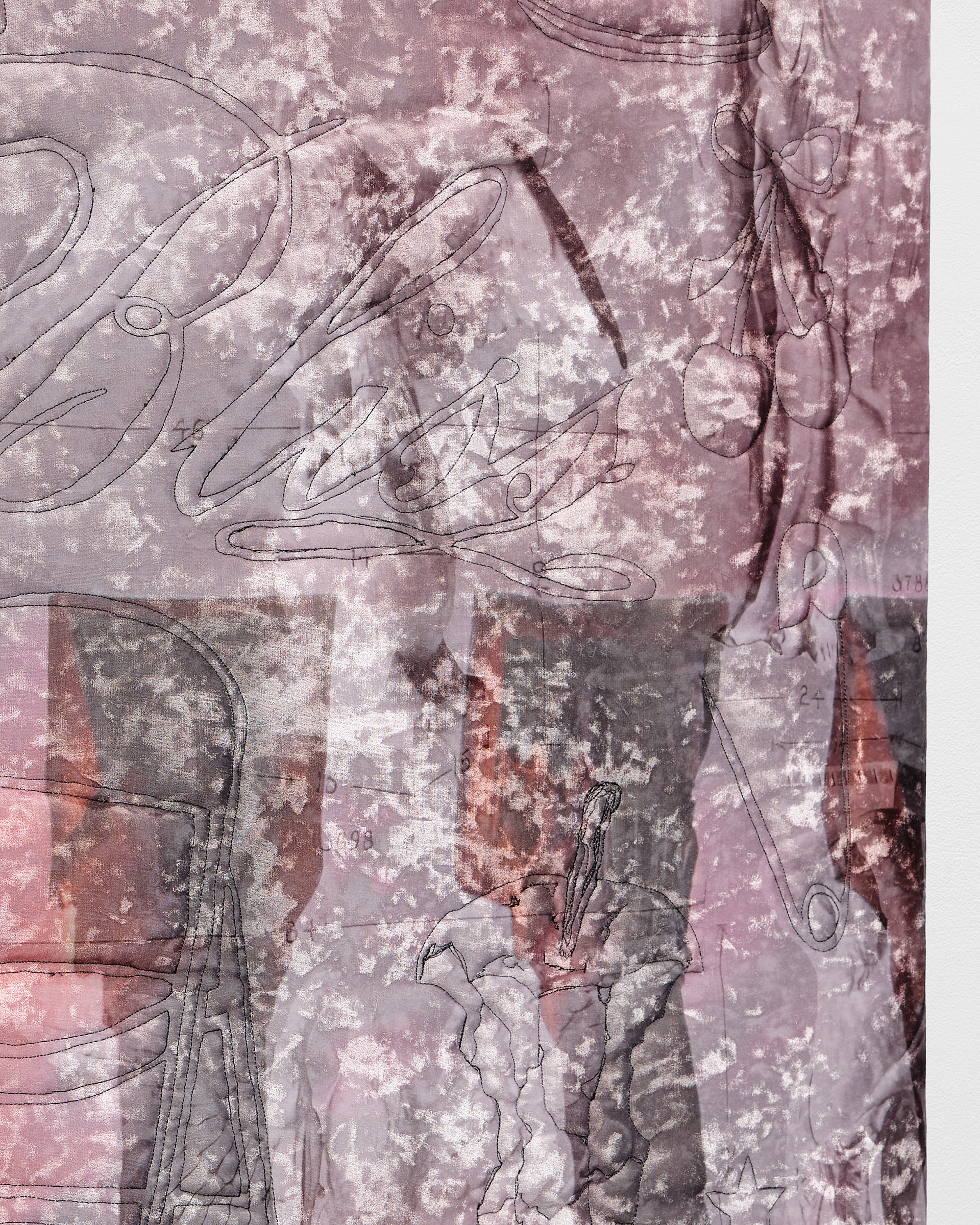 Extending this lineage to the digital age, San Francisco artist Rel Robinson (b. 1995, Los Angeles, CA) merges historical material culture with emerging technologies. Her quilted velvet works layer AI-generated imagery—such as Corinthian columns and Tiffany lamps—with scans from early 20th-century interior design catalogs. Velvet, a fabric historically tied to opulence and power, becomes a medium where beauty and critique collide. The works evoke a shared visual memory, oscillating between nostalgia and immediacy, between the ornamental and the deeply personal. Drawing a direct line from the Jacquard loom to her hybrid process, where stitching and digital generation converge, Robinson’s practice challenges the relationship between aesthetics, memory, and power.