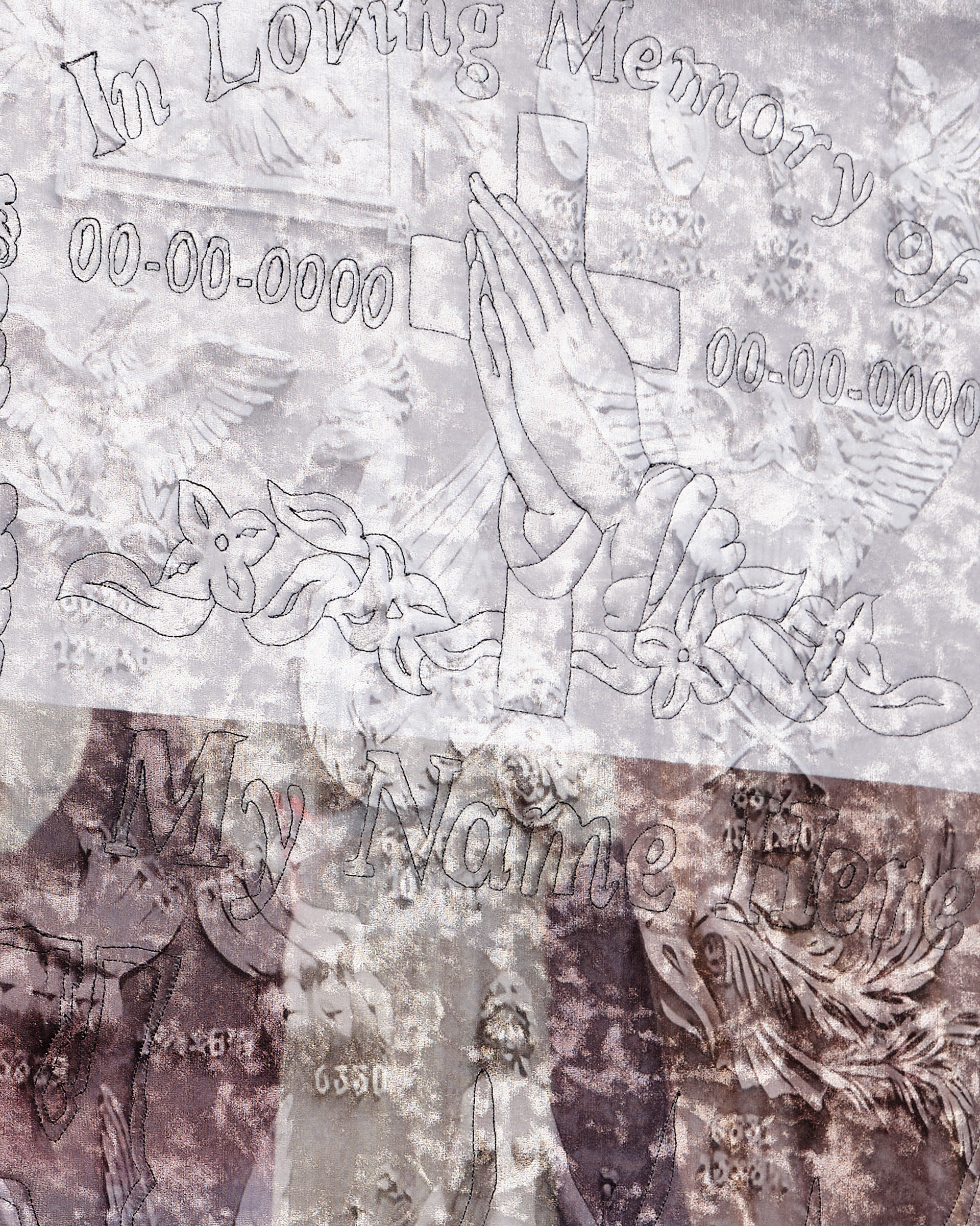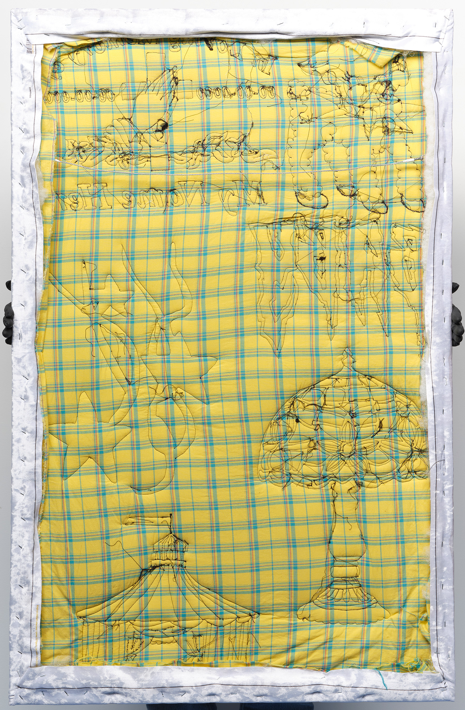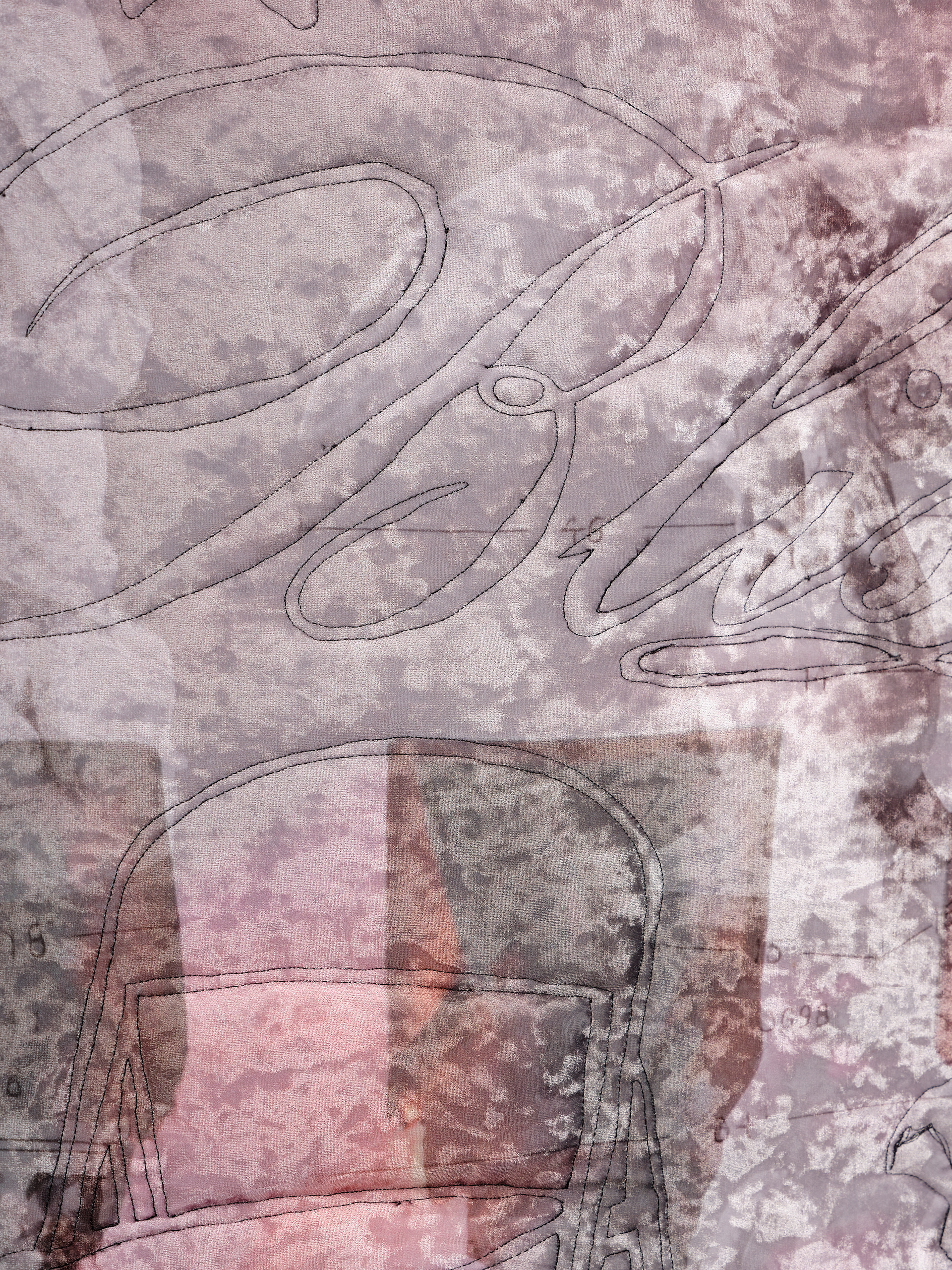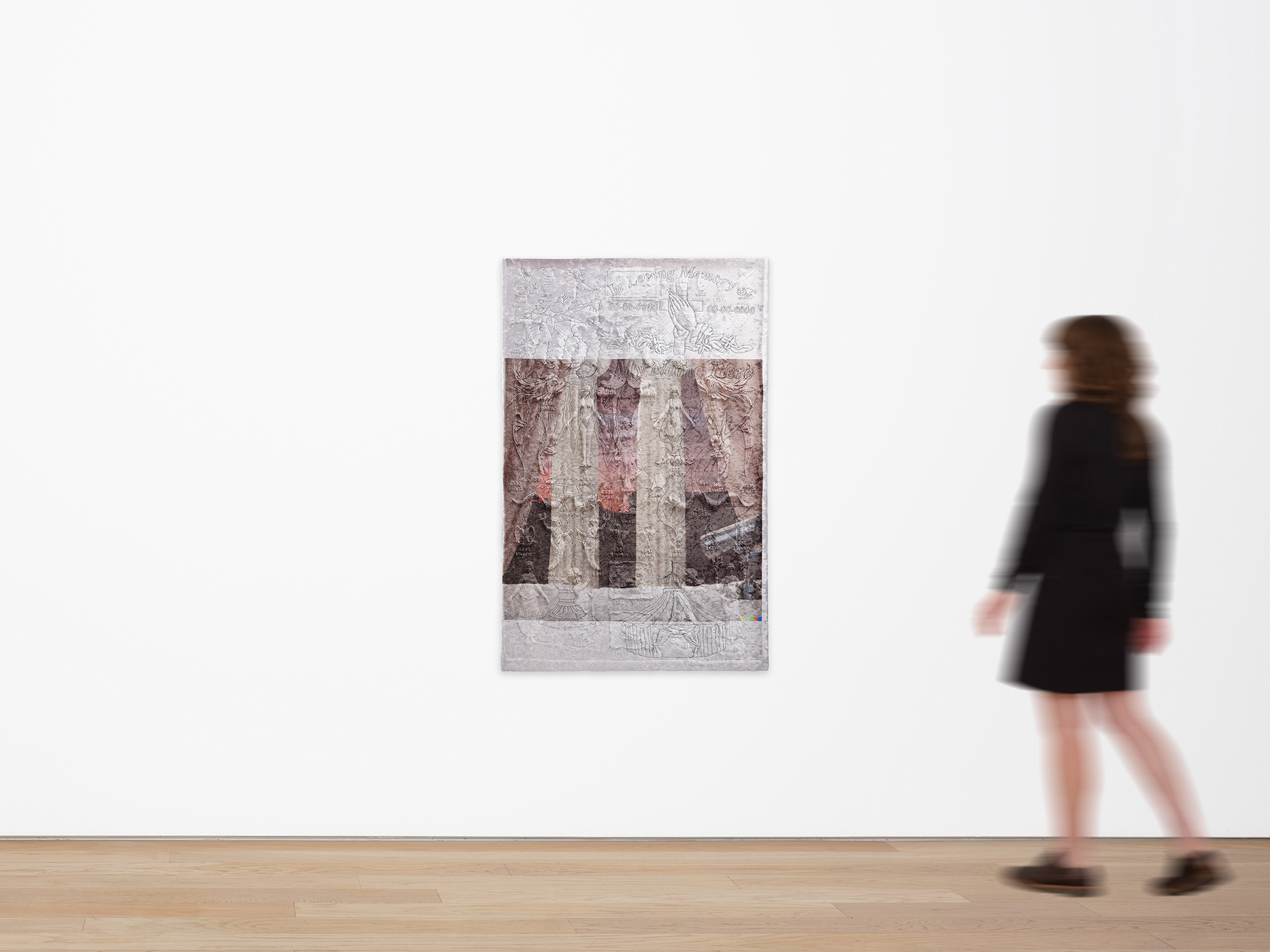 Extending this lineage to the digital age, San Francisco artist Rel Robinson (b. 1995, Los Angeles, CA) merges historical material culture with emerging technologies. Her quilted velvet works layer AI-generated imagery—such as Corinthian columns and Tiffany lamps—with scans from early 20th-century interior design catalogs. Velvet, a fabric historically tied to opulence and power, becomes a medium where beauty and critique collide. The works evoke a shared visual memory, oscillating between nostalgia and immediacy, between the ornamental and the deeply personal. Drawing a direct line from the Jacquard loom to her hybrid process, where stitching and digital generation converge, Robinson’s practice challenges the relationship between aesthetics, memory, and power.
